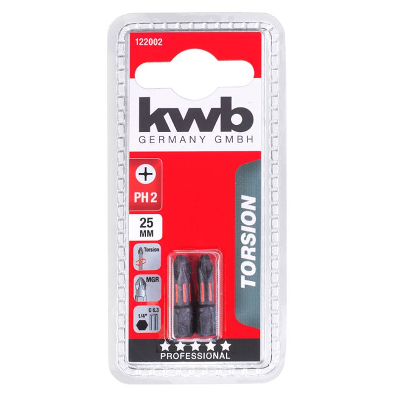 Este set de puntas Torsion de KWB te ofrece durabilidad y precisión superior para tus trabajos de atornillado. Con dos unidades de puntas Phillips PH2 de 25 Mm, vas a tener el recurso ideal para tus tareas de ensamblaje y construcción.