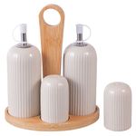 Organizá tus condimentos y aderezos con este elegante set de aceiteras y condimenteros. Su diseño moderno en gres con detalles en bambú va a darle un toque de distinción a tu cocina.