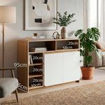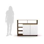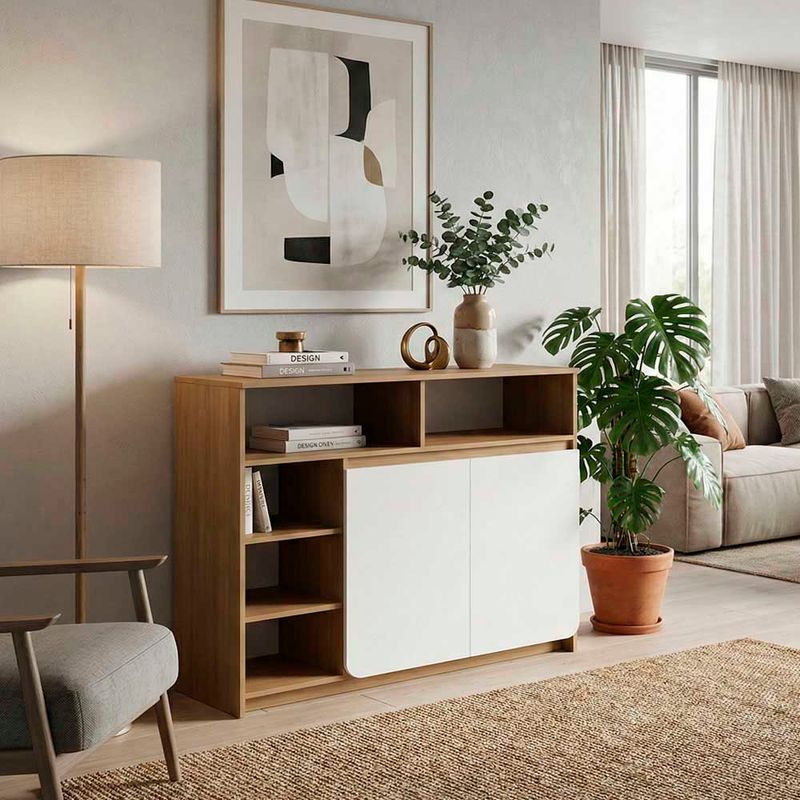 Este mueble se destaca por su diseño funcional que maximiza el espacio de guardado. Sus diferentes compartimentos te permiten organizar el decodificador, consolas y otros dispositivos, mientras que las puertas ocultan aquellos elementos que preferís mantener fuera de la vista. Su combinación de colores neutros se integra fácilmente con cualquier decoración.