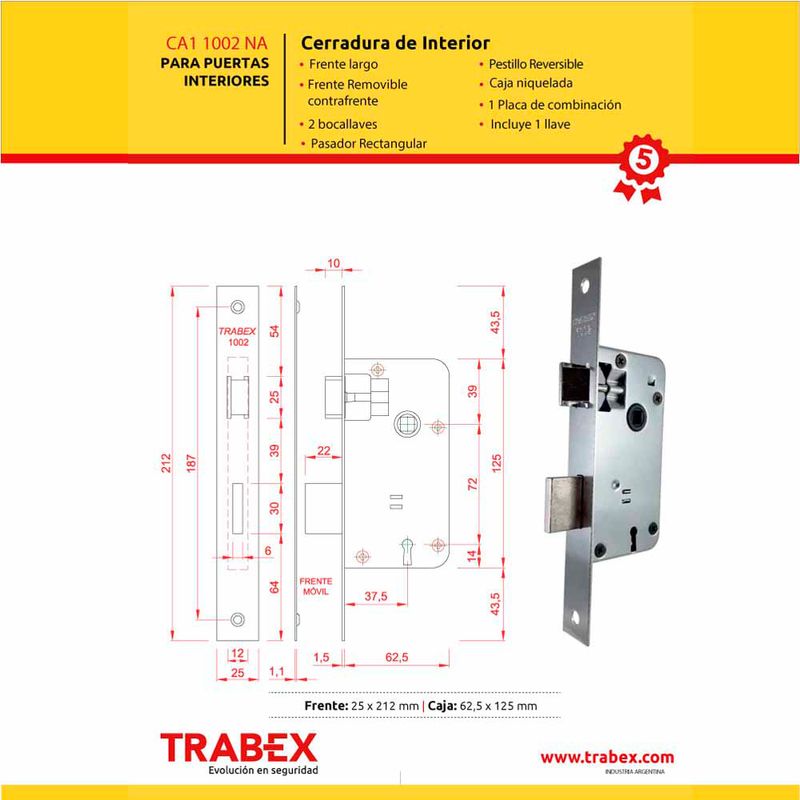 Características Destacadas Cerradura de Interior 1002 Niquelada Frente Largo TRABEX