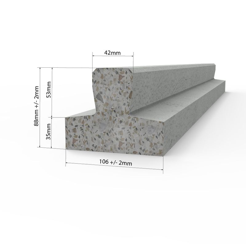 - Fabricada en hormigón pretensado de alta resistencia, con medidas de 106x42x8 Cm