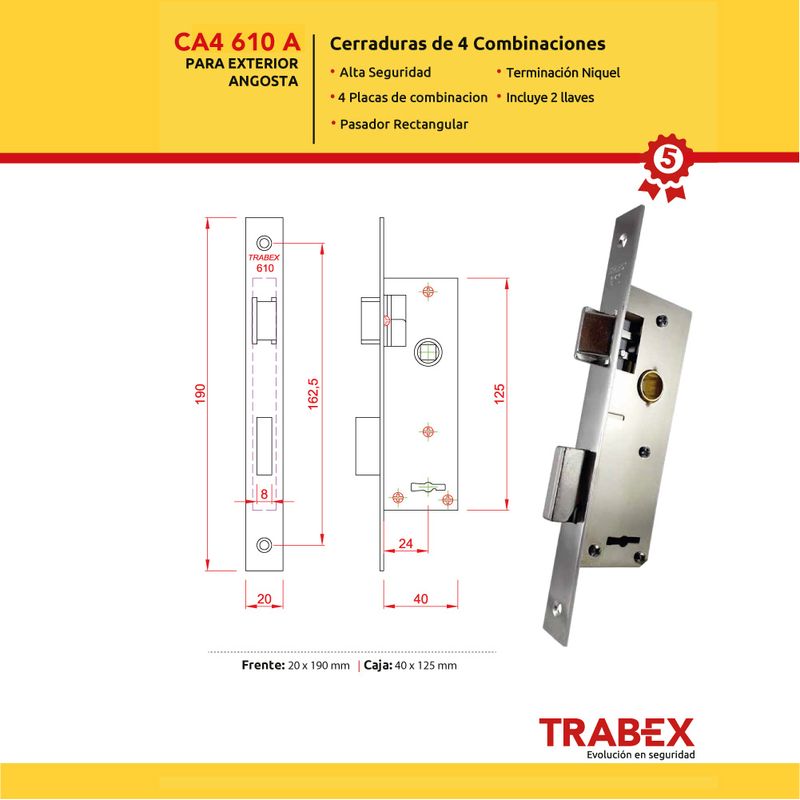 Características Destacadas Cerradura Alta Seguridad 610 de Acero Níquel Angosta TRABEX